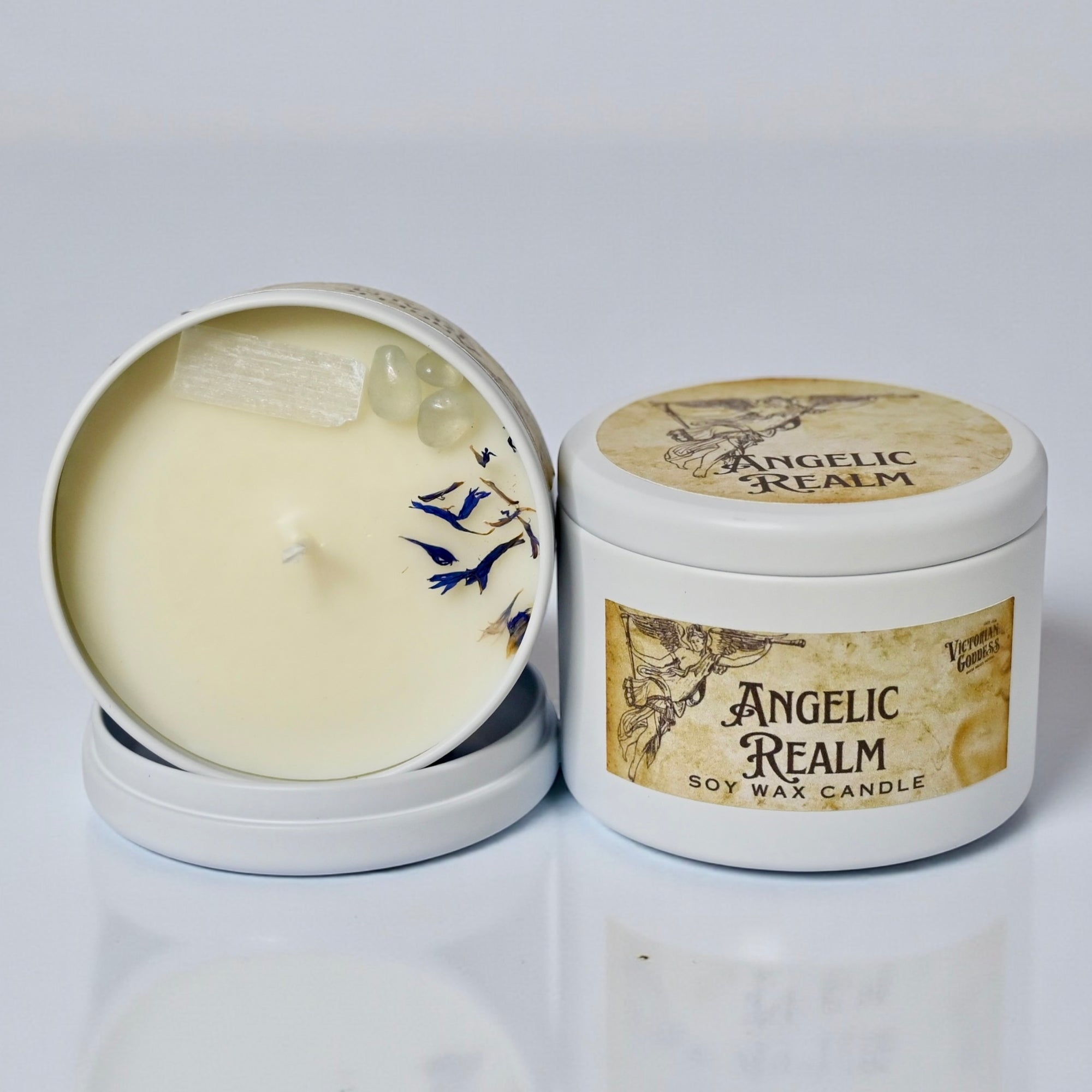 Each Angelic Realm Candle is lovingly adorned with carefully selected crystals and botanicals, making every candle unique. The crystals may vary depending on availability and may include Selenite, Angel Aura, Clear Quartz, or Celestite, chosen for their calming, uplifting, and angelic qualities. The candle is also finished with delicate blue cornflower petals, adding a soft, ethereal beauty and enhancing its heavenly presence.